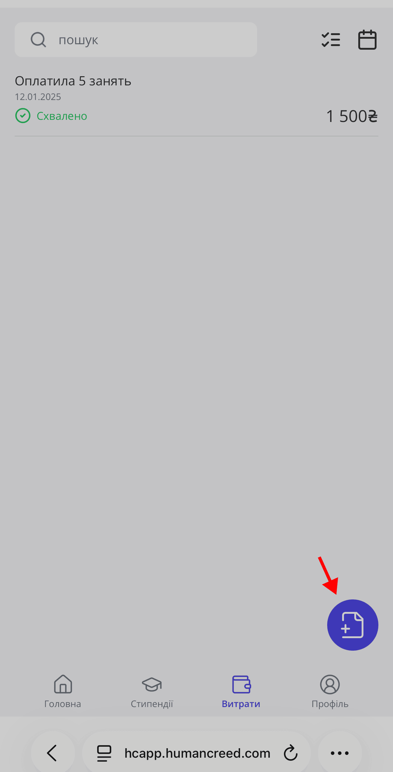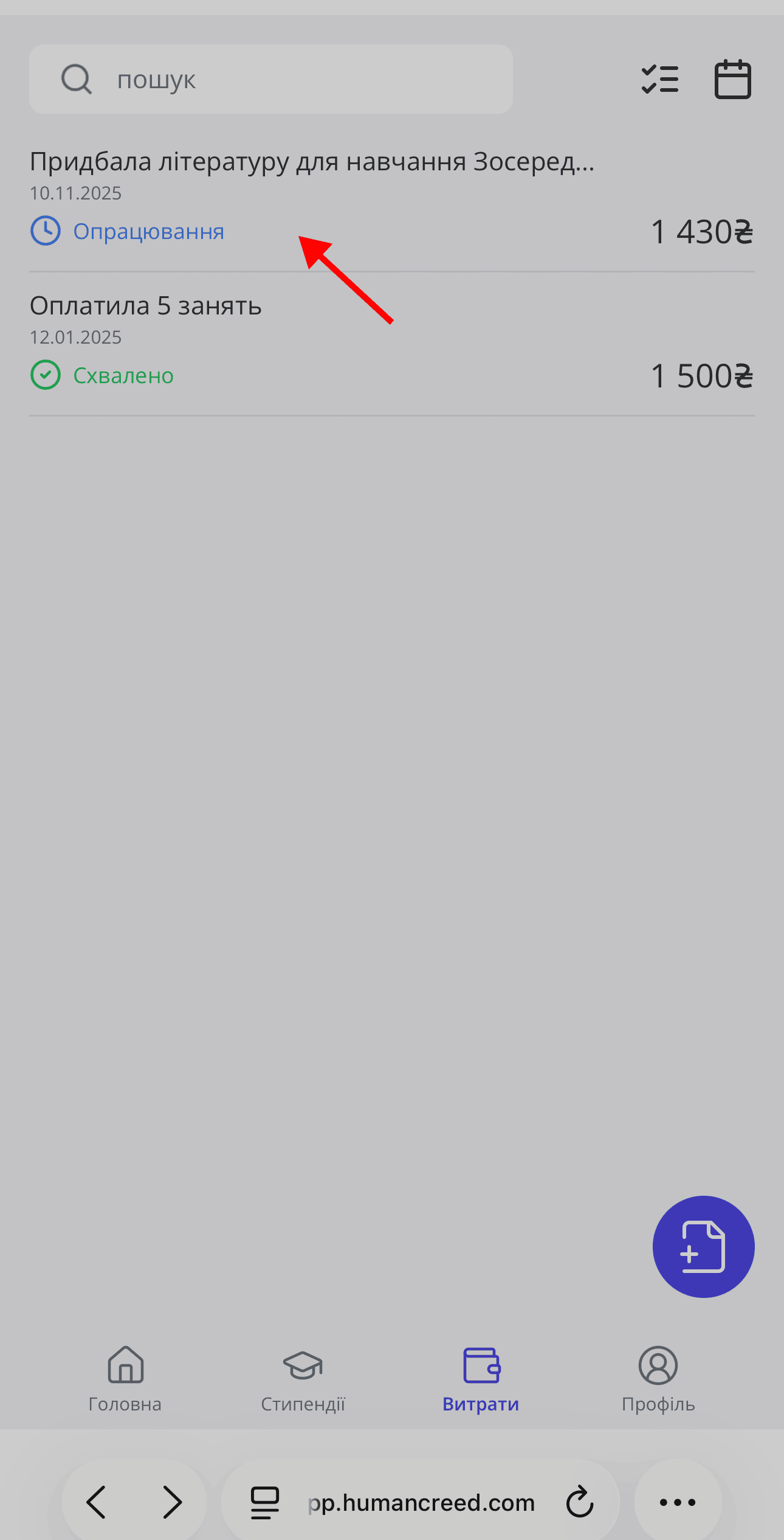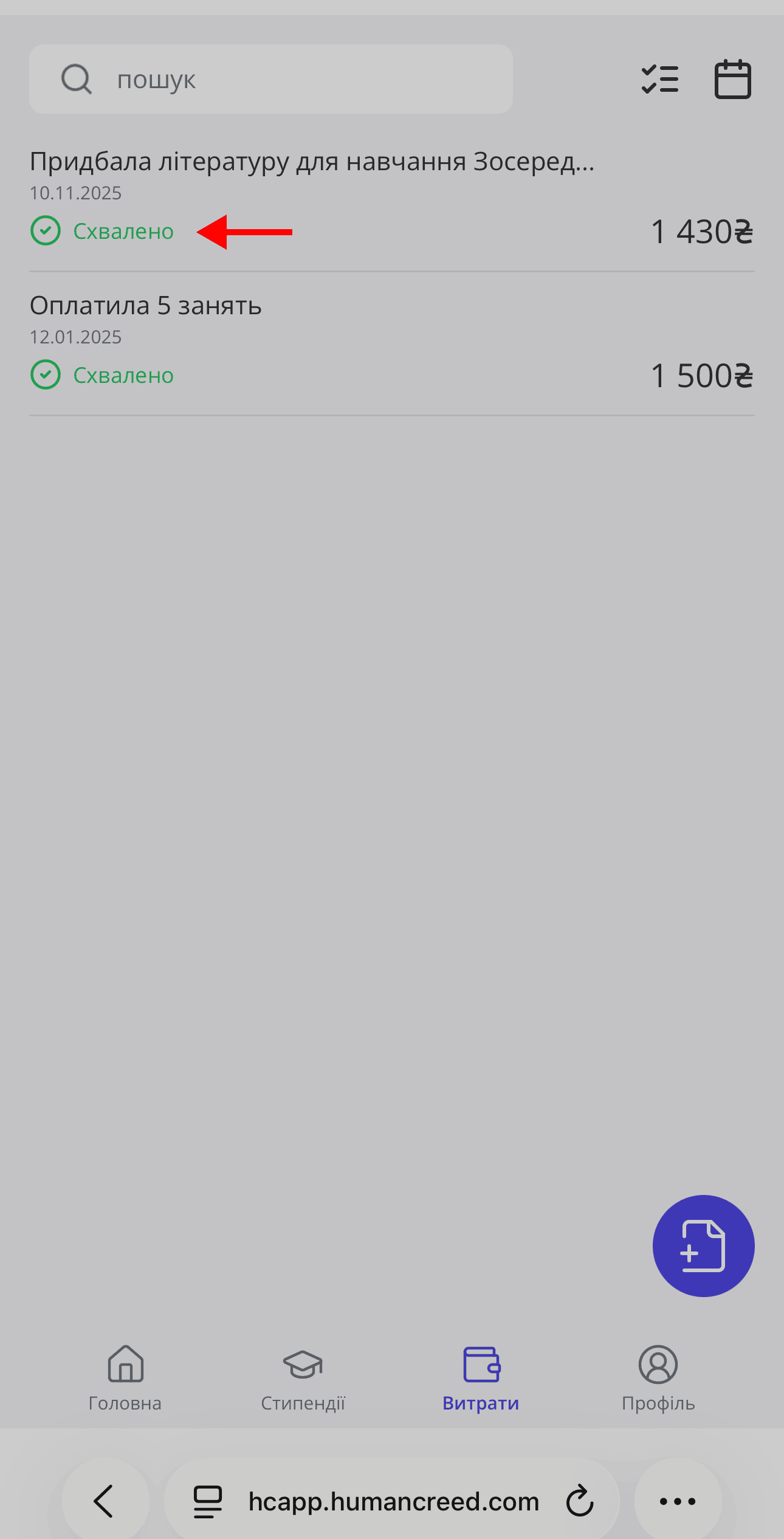 Оберіть необхідний фільтр (зліва статус опрацювання, далі дата та поле пошуку для опису витрати).