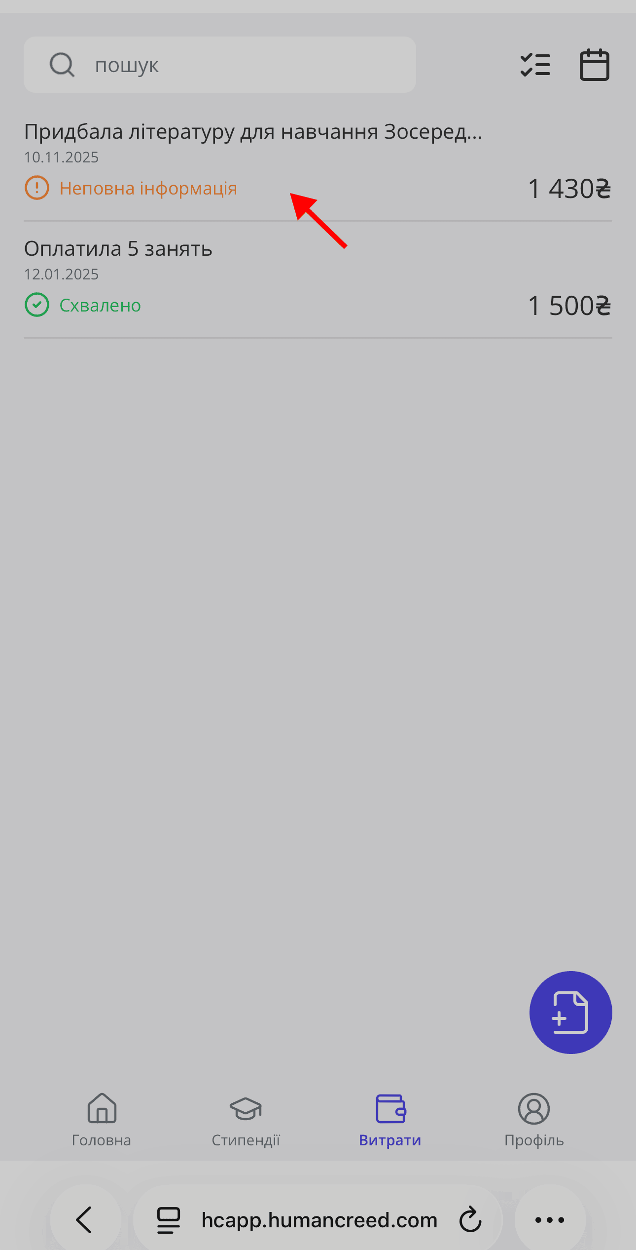 Щоб внести зміни до звіту, що має статус Неповна інформація, перейдіть у додатку на сторінку Витрати.